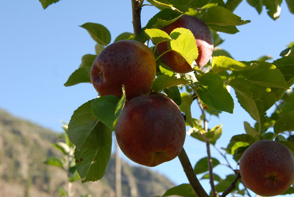 When taking photos of apples here, the clear blue sky and soaring mountain peaks are a big part of the photo. In most, you can see the top of a mountain in the background, a reminder that it is a relatively close valley, the mountains looming huge above the trees.